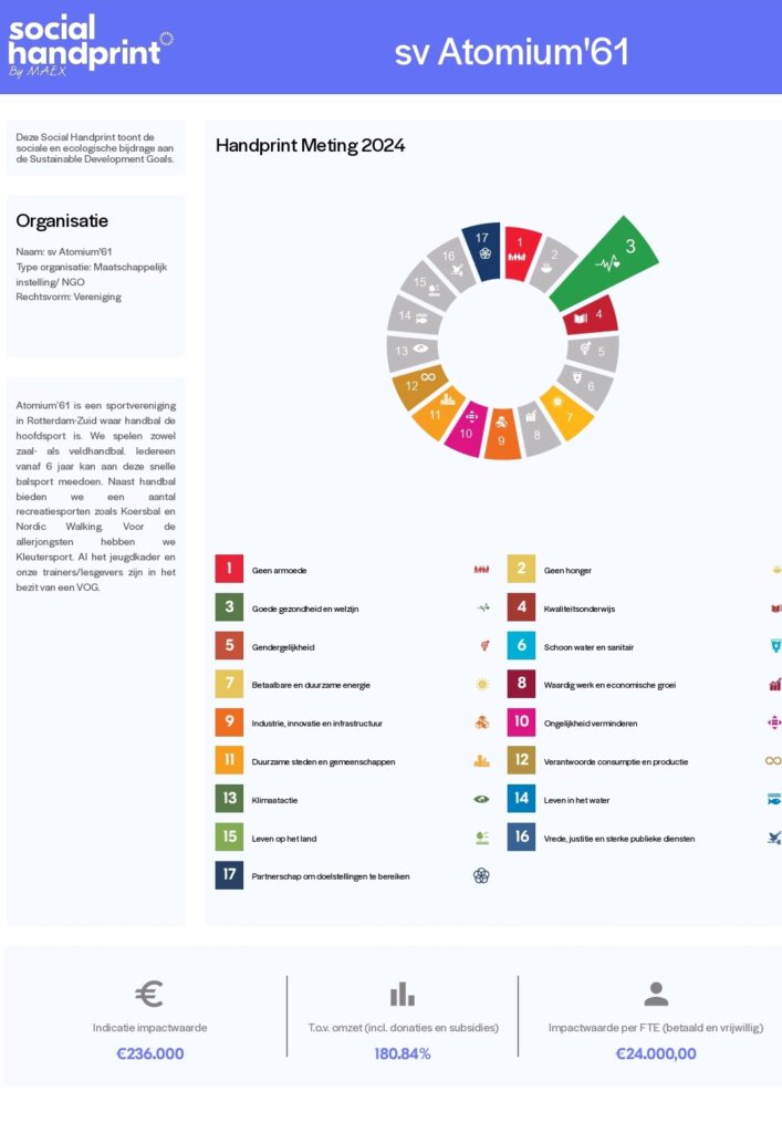 De Social Handprint (ook wel maatschappelijk jaarverslag genoemd) laat zien welke positieve impact onze vereniging in 2024 heeft gehad op een aantal maatschappelijke onderwerpen.