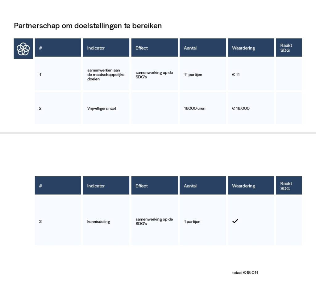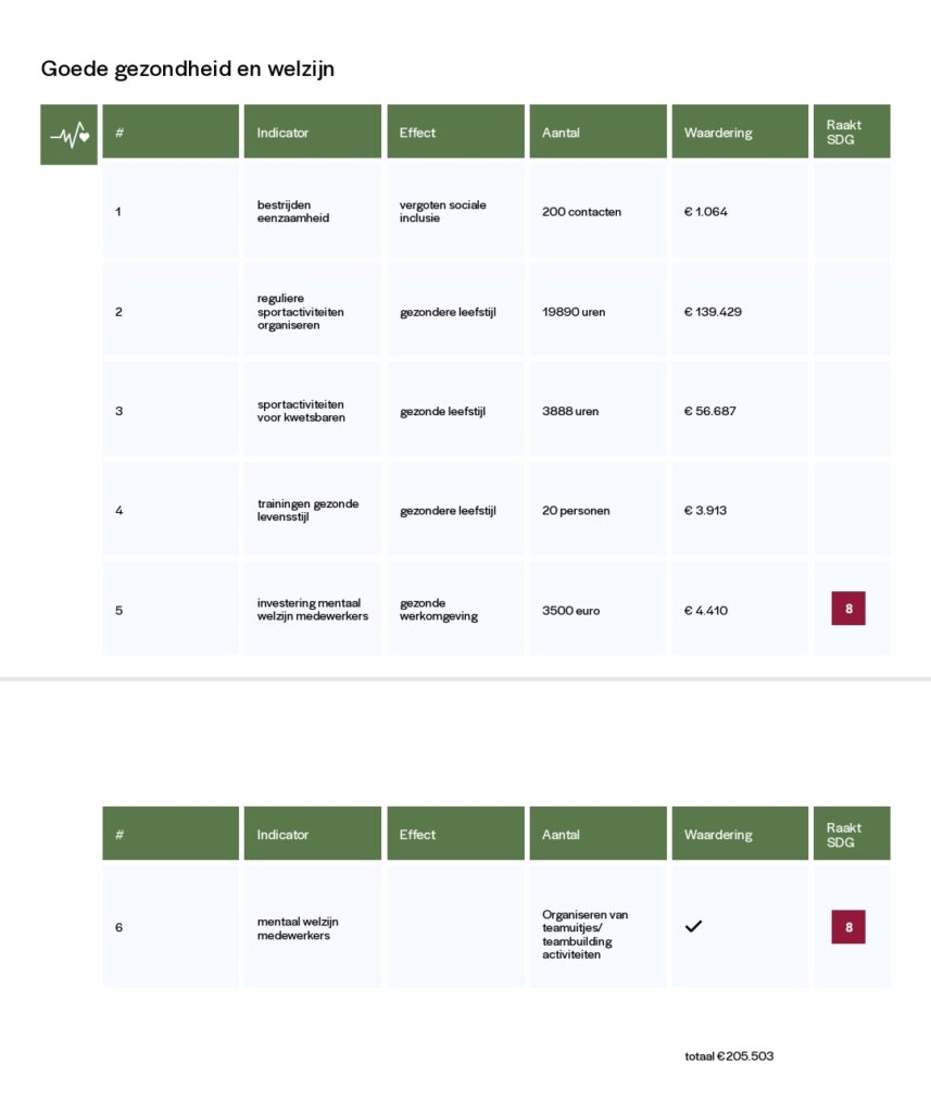 Trots kunnen we melden dat onze corebusiness (3. Goede gezondheid en welzijn, waar alle onze sportactiviteiten onder vallen) er met een waardering van €205.503 uitspringt. Met als goede tweede 17.Partnerschap met een waardering van €18.000.